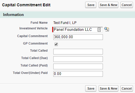 4. Edit the Capital Commitment record created in Step 3 to check off the 'GP Commitment' field. This will then roll-up and populate the GP Commitment field on the Fund record.
