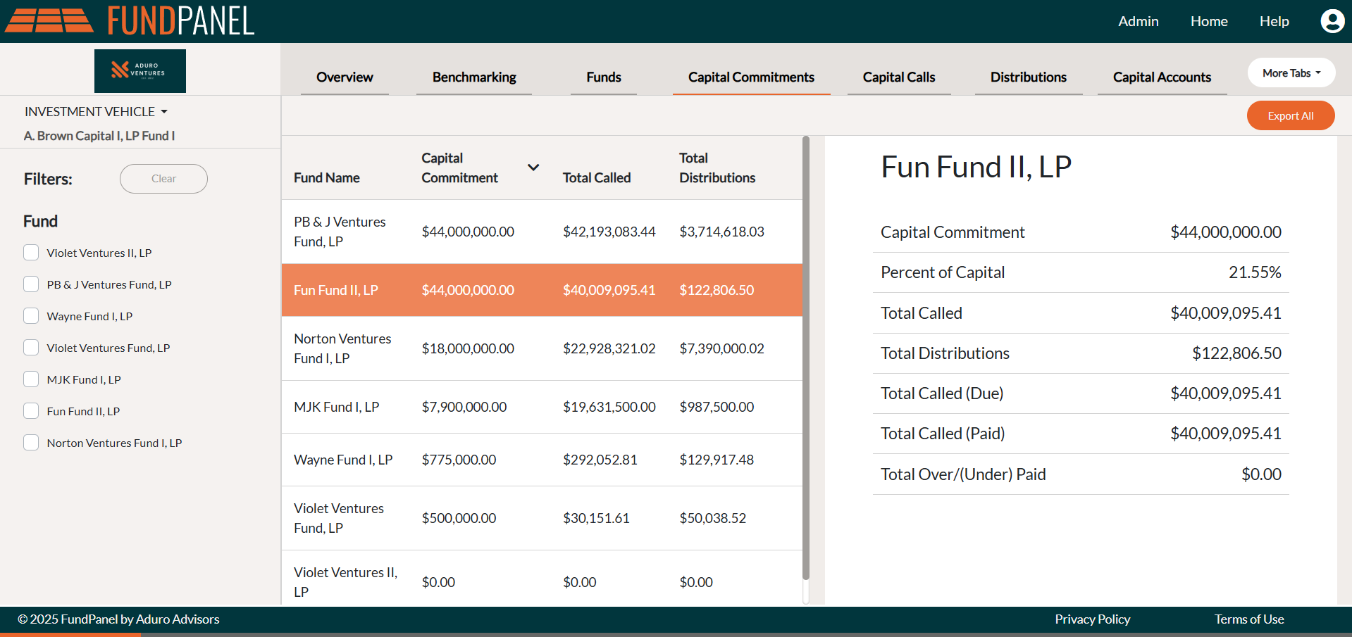 - % of Total Committed Capital: a chart breaking down your Commitment percentage across every entity under the organization