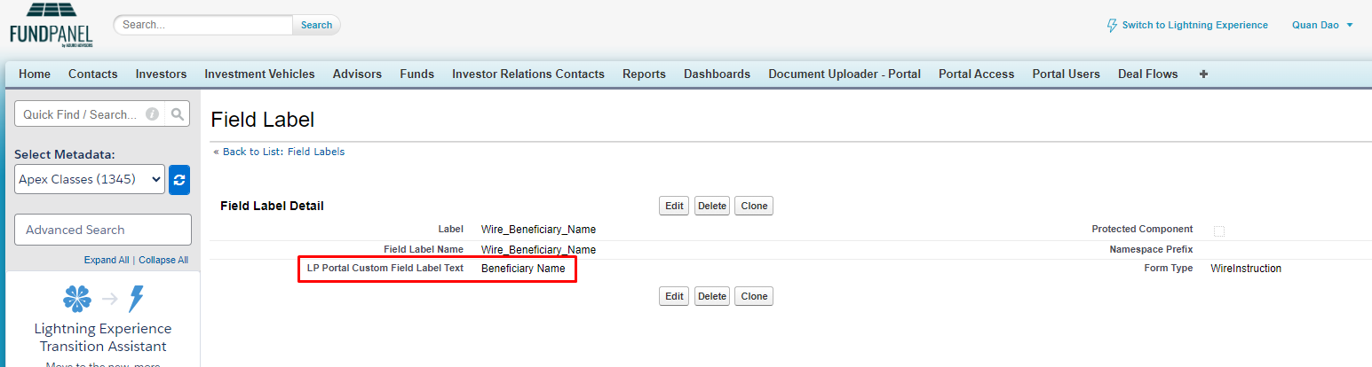 Ensure you only make changes to the LP Portal Custom Field Label Text field. Do not modify any other field in this page.