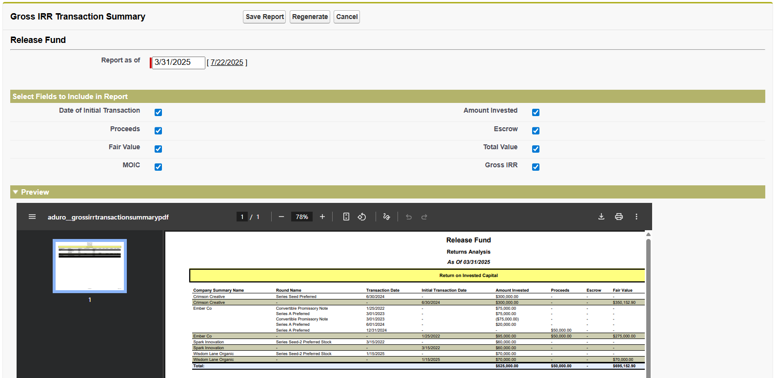 - A new button has been added to the Fund to automatically generate a comprehensive Gross IRR Transaction Summary.